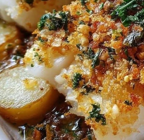 Serve: Serve the baked cod with lemon slices and garnish with extra chopped parsley. The crispy breadcrumb topping pairs beautifully with the soft, flaky fish and roasted potatoes.