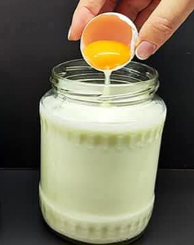 3. Add starter – In a jar, mix a few tablespoons of yogurt (or the culture, or as seen in the photo, possibly egg yolk if making a richer version) with a little warm milk to thin it, then pour it back into the jar with the rest of the milk. Stir gently.